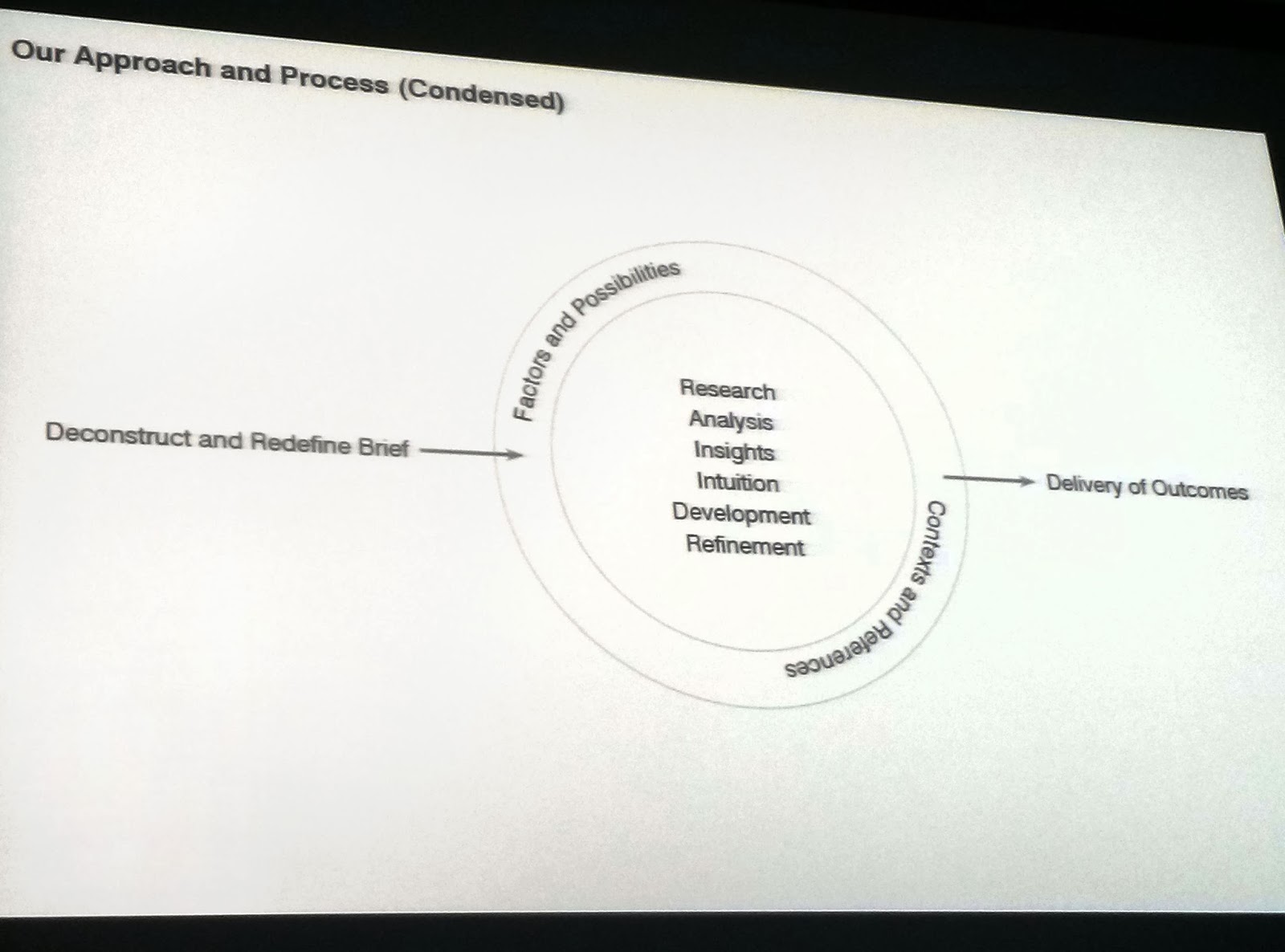 At the start of the presentation, they made a disclaimer: They were not going to talk about research. Instead, they shared with us their beliefs of the design process, and how it works for them. Here is a chart of their design process:
